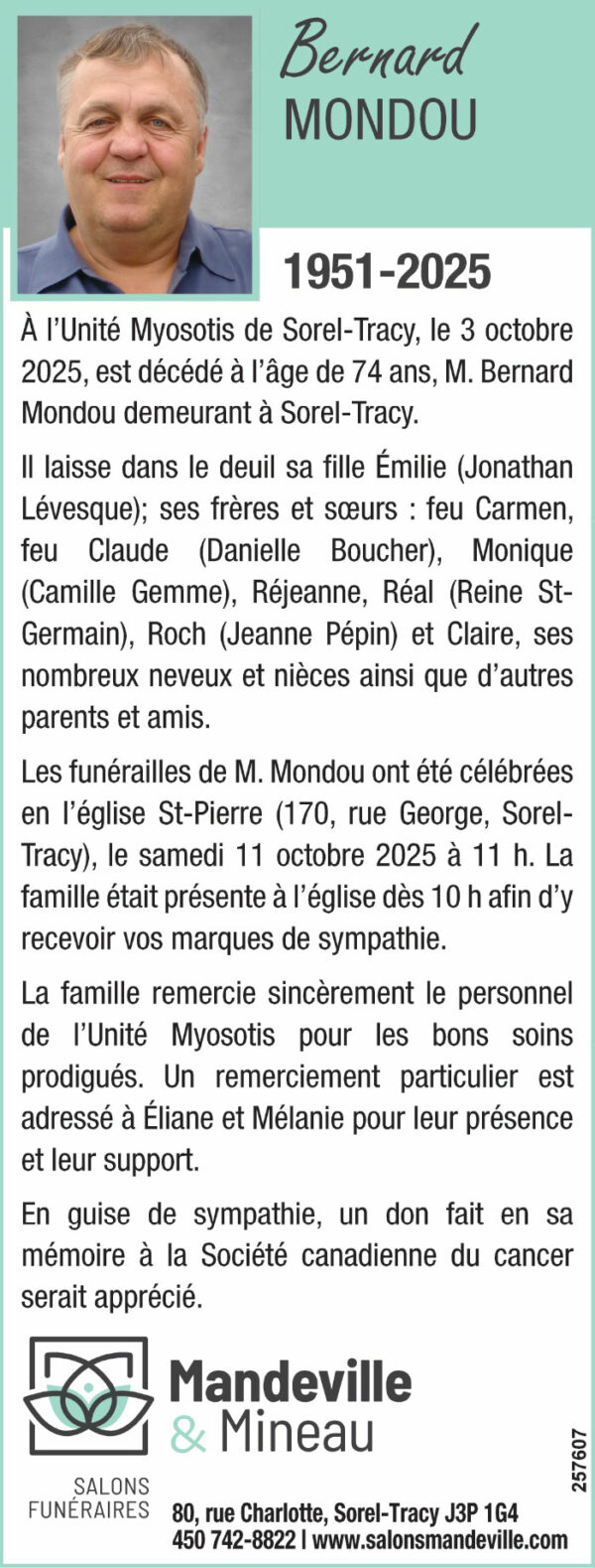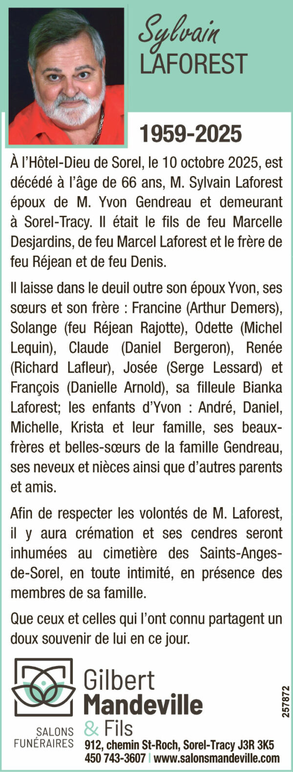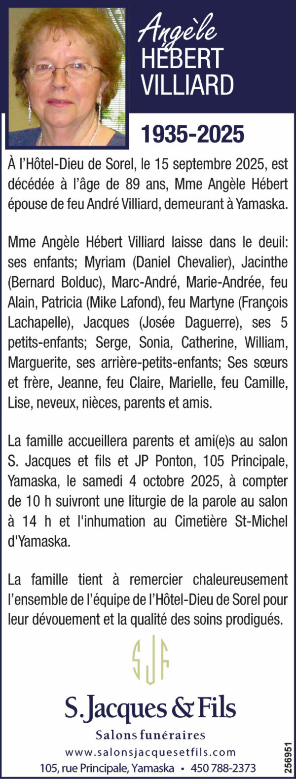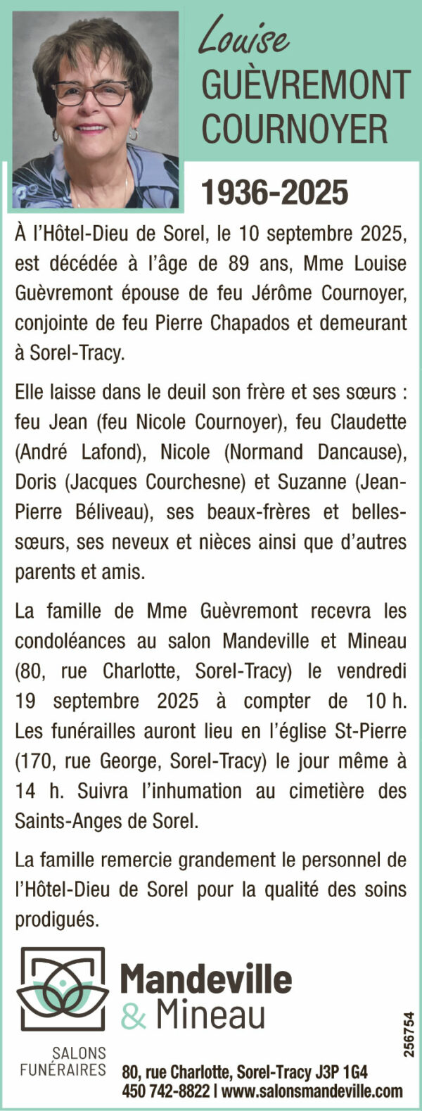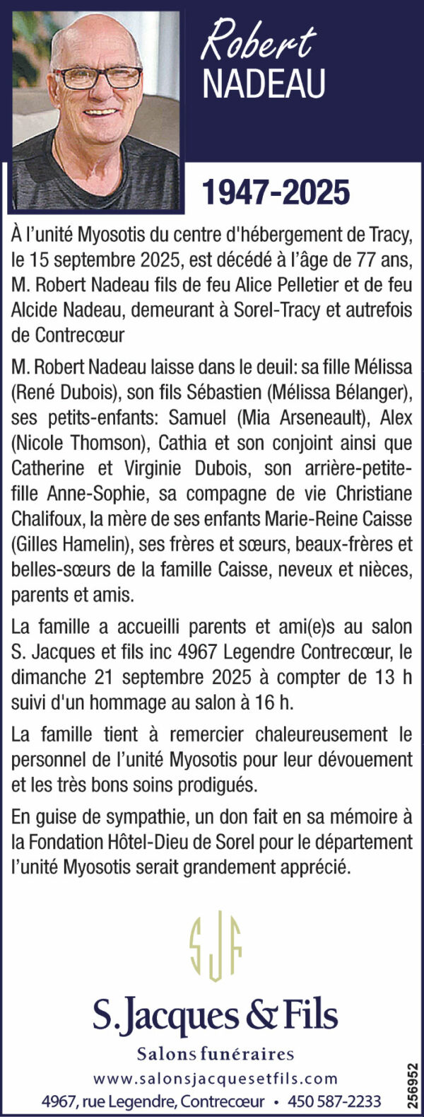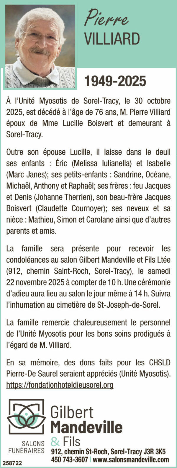 Bienvenue dans la section nécrologie SOREL-TRACY du journal Les 2 Rives. Nous diffusons les avis de décès de la région de Sorel-Tracy à chaque semaine.