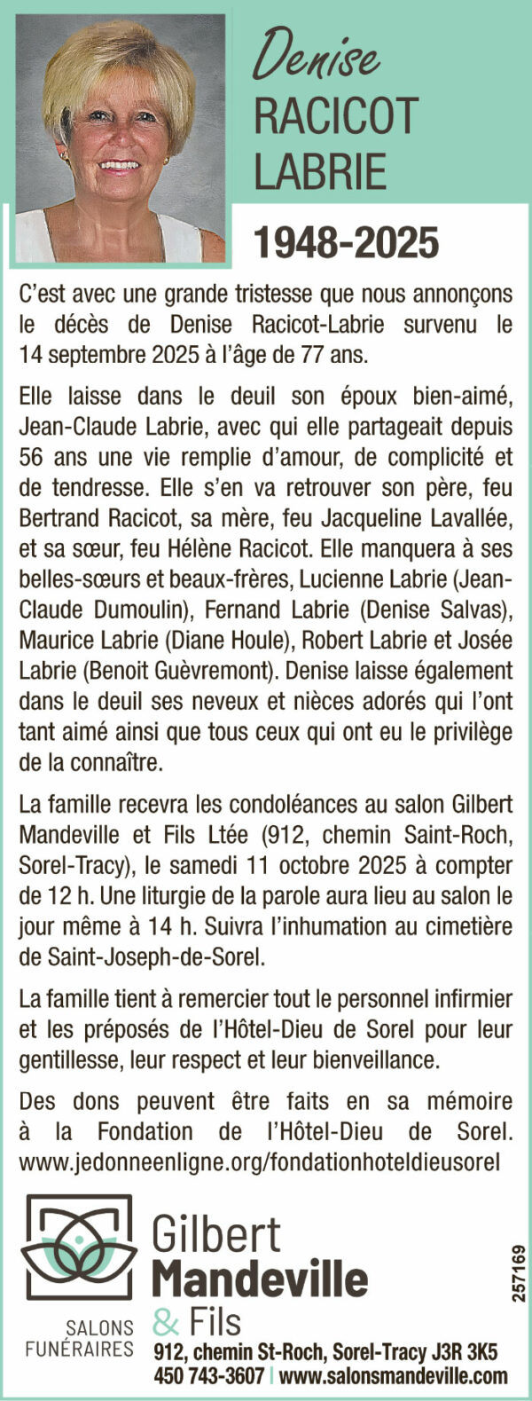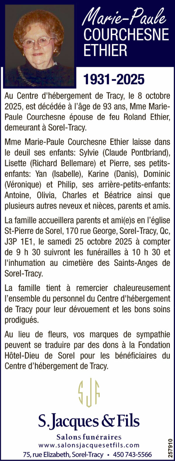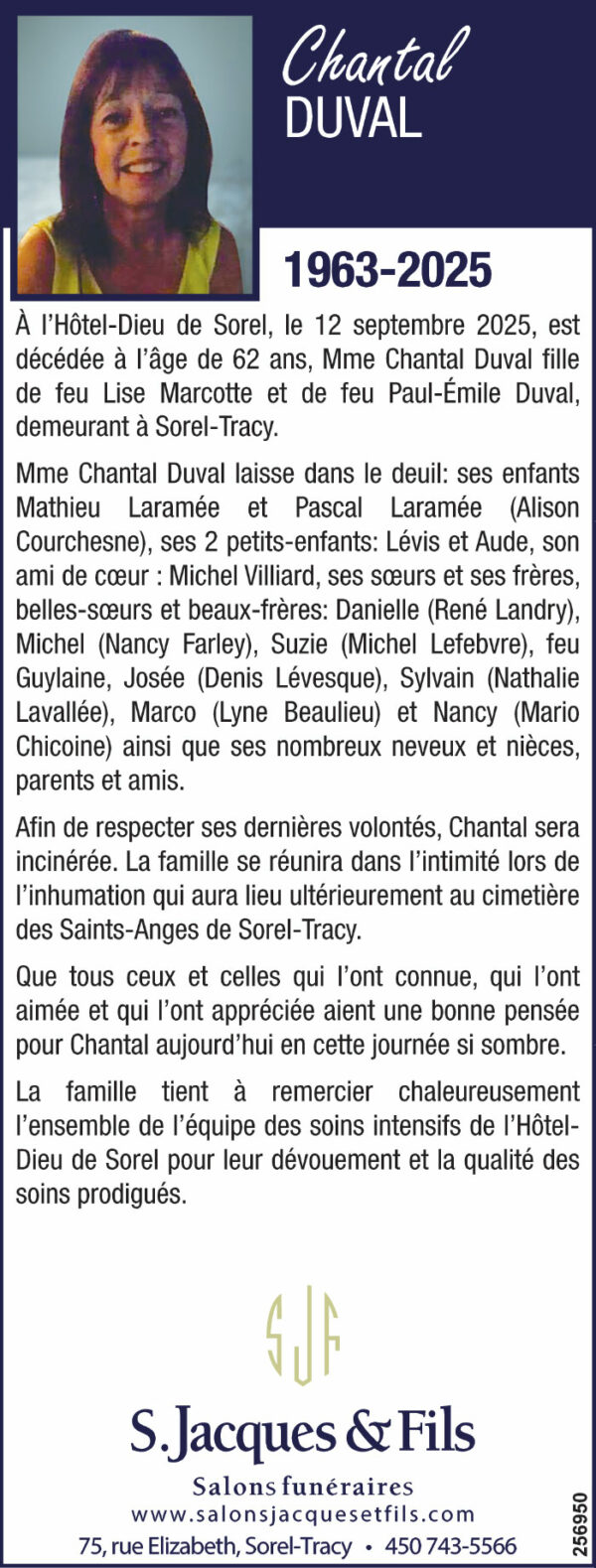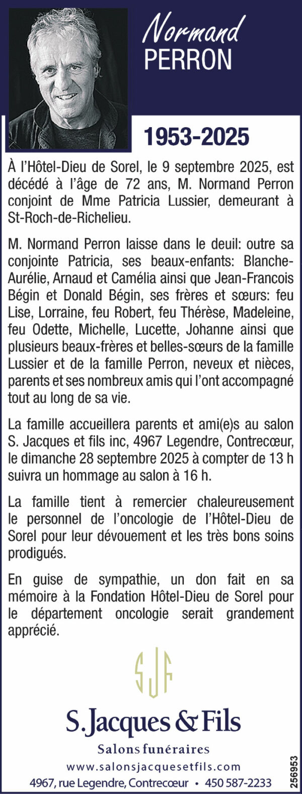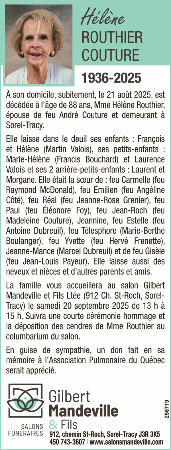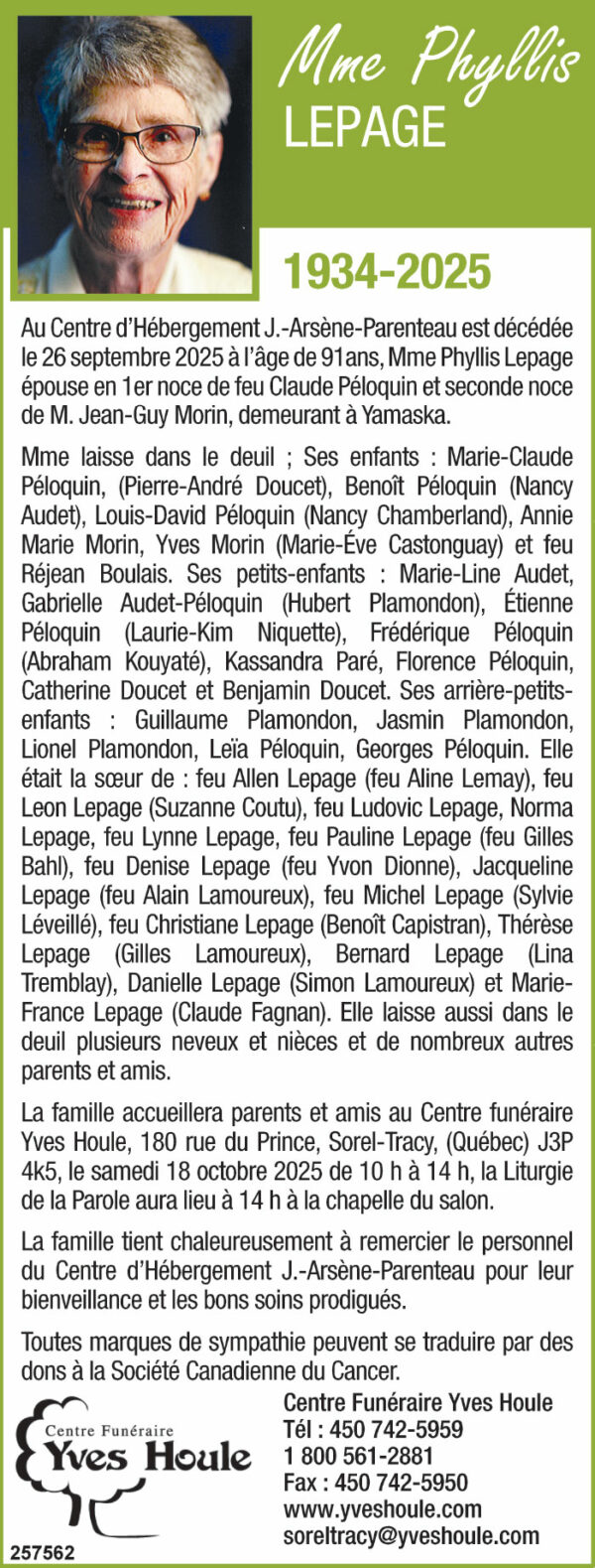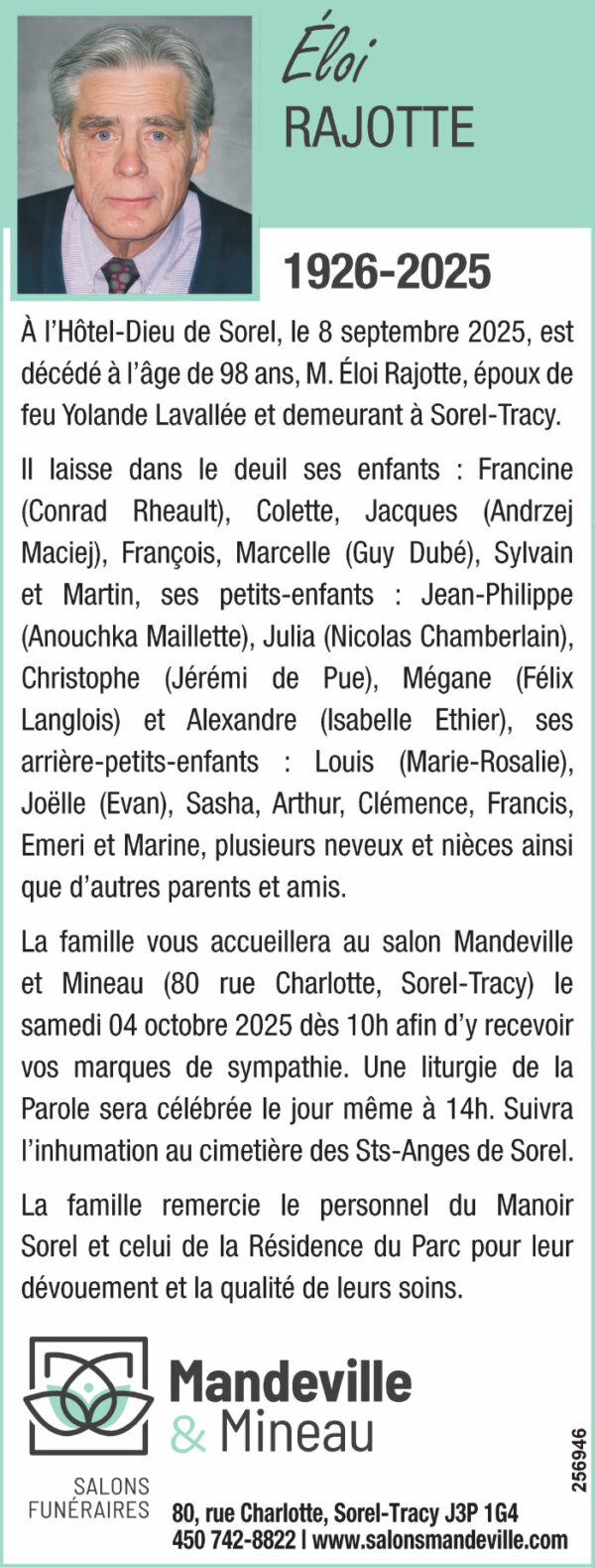 Bienvenue dans la section nécrologie SOREL-TRACY du journal Les 2 Rives. Nous diffusons les avis de décès de la région de Sorel-Tracy à chaque semaine.