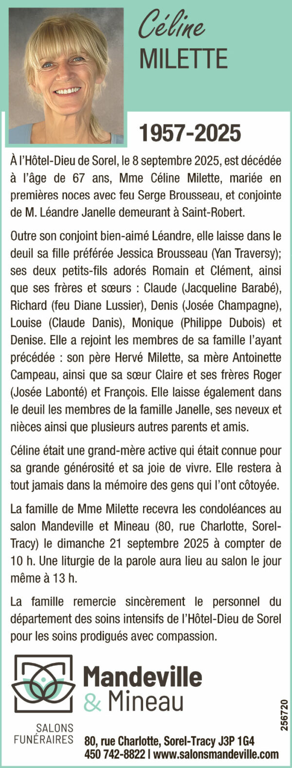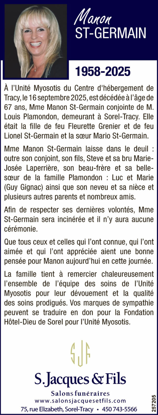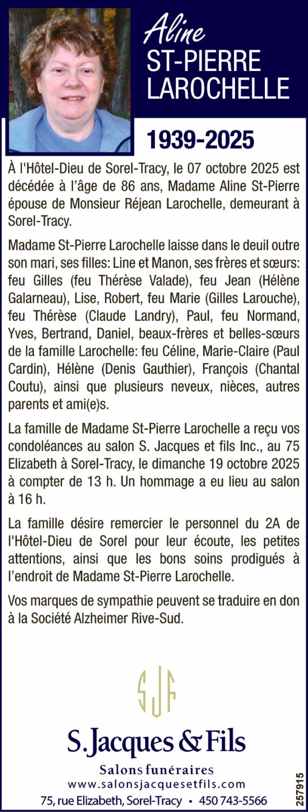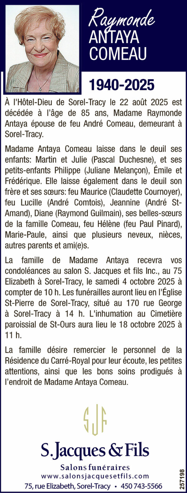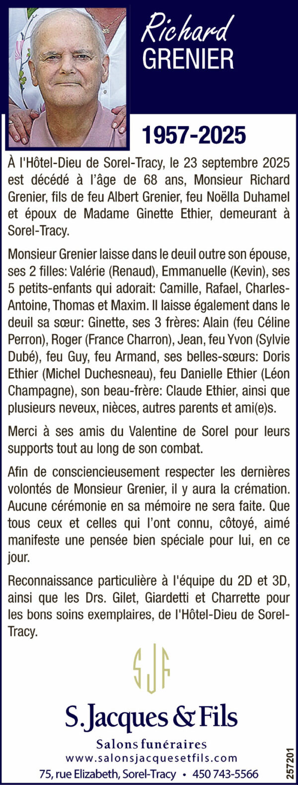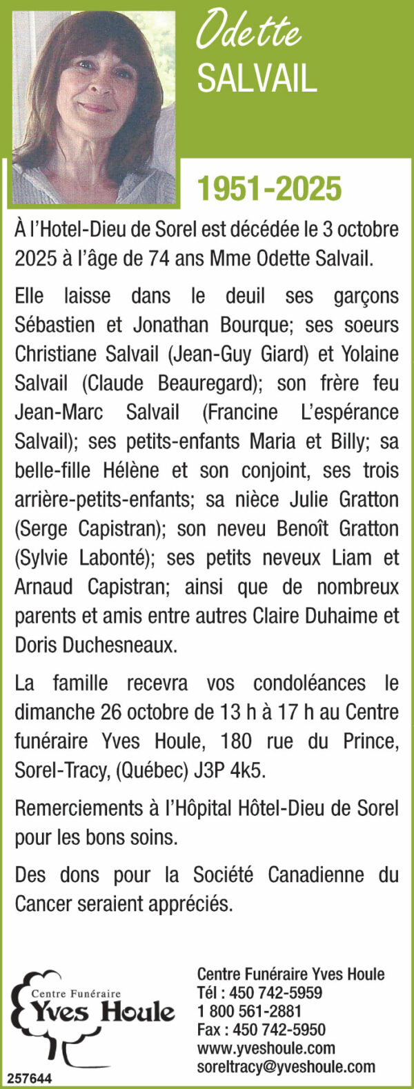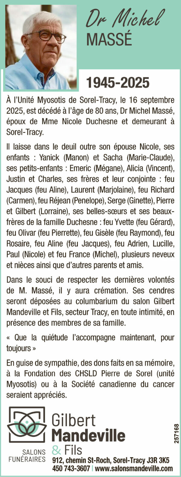 Bienvenue dans la section nécrologie SOREL-TRACY du journal Les 2 Rives. Nous diffusons les avis de décès de la région de Sorel-Tracy à chaque semaine.