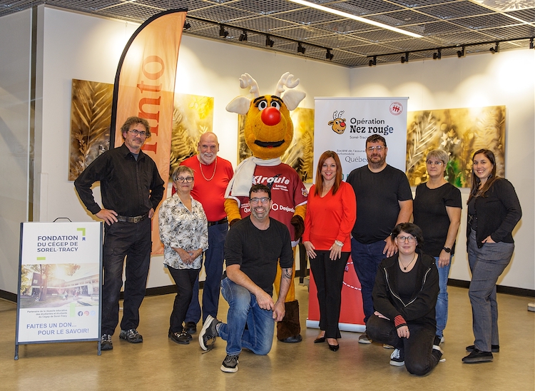 De gauche à droite, quelques membres du comité organisateur de l’Opération Nez rouge Sorel-Tracy entourant Myriam Arpin, directrice générale de la Fondation du Cégep de Sorel-Tracy et la mascotte Nez Rouge : François Lefebvre, France Massicotte, agente d'administration à la Fondation, Michel Laroche, Jean-Marc Mainella, Joël Dionne, Andréanne Lefebvre, Claudia Lafond, adjointe à la Fondation. Photo Jean-Marc Mainella