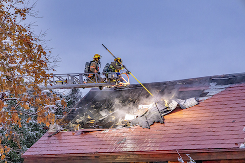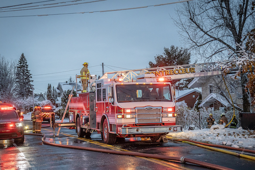 Au total, le Service a reçu une douzaine d’appels en deux jours, dont trois pour des incendies majeurs. À commencer par celui reçu vers 3 h dans la nuit du 11 au 12 novembre, pour une résidence unifamiliale de la route Marie-Victorin. Dès l’arrivée des pompiers, les flammes s’échappaient déjà d’un des côtés de la maison.